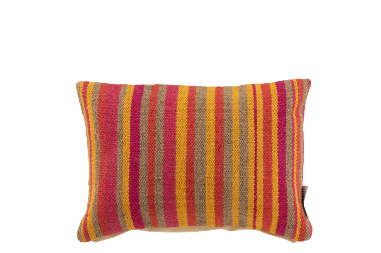 Coussin rectangulaire en jute avec fines rayures rouge/orange/ocre/rose ANNA