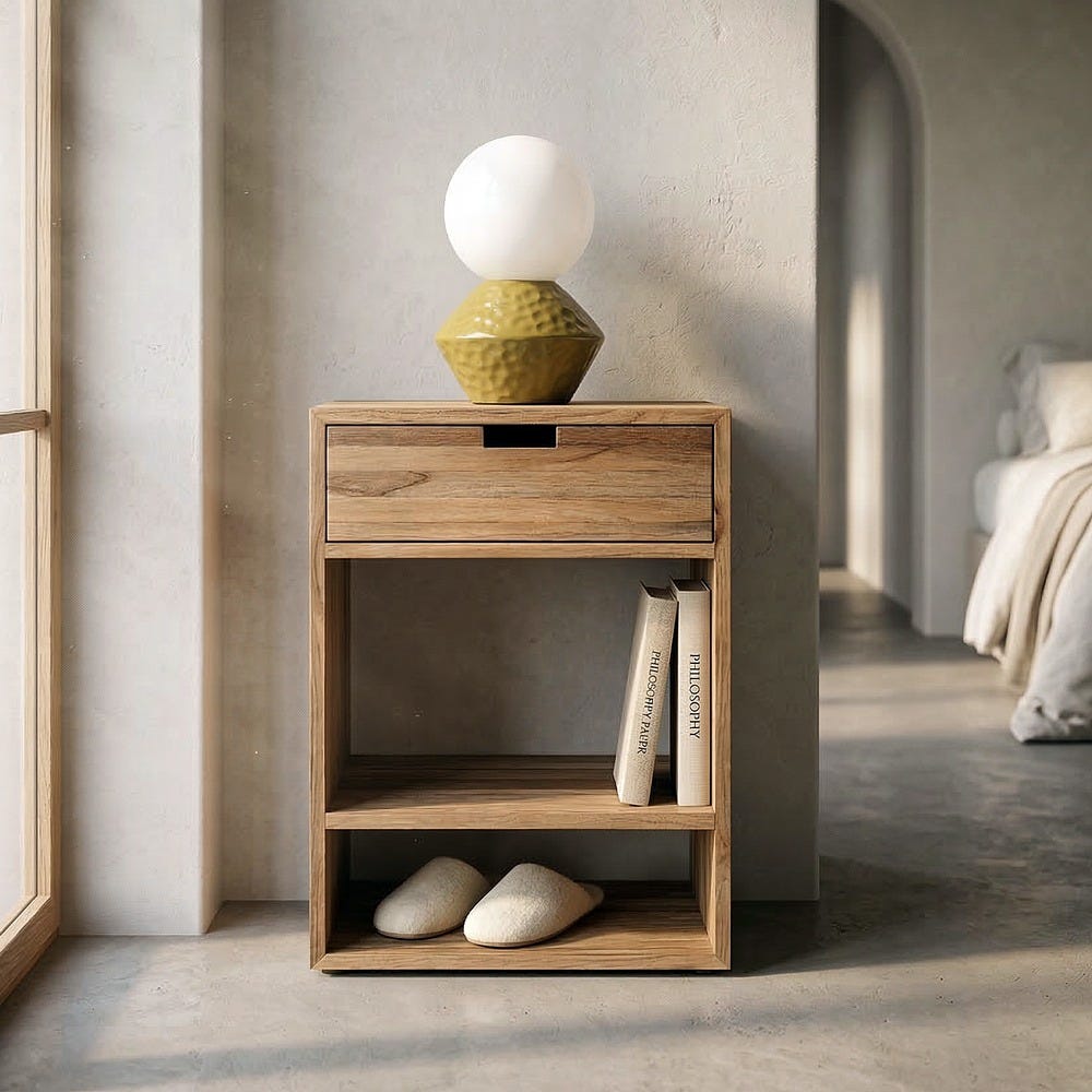 Le teck naturel est l’un des bois les plus nobles et les plus rares du mobilier de qualité — dense, huileux, naturellement résistant, il développe avec le temps une patine dorée incomparable. Ce meuble chevet en teck naturel avec 1 tiroir, compact au format 45 x 30 x 60 cm, apporte cette noblesse rare au chevet de votre lit avec une discrétion et une élégance naturelle exemplaires.