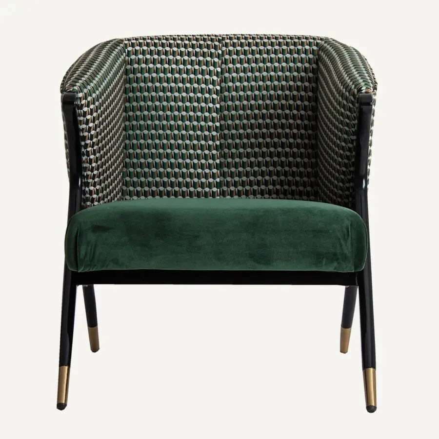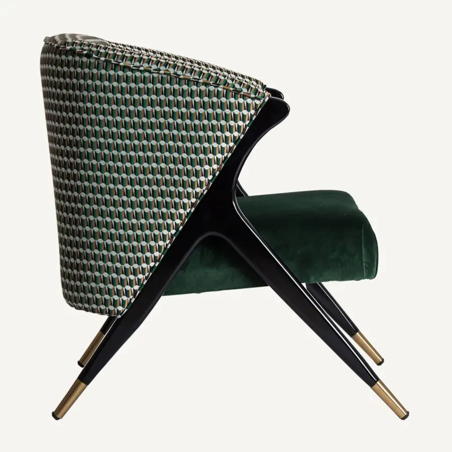Coup de coeur pour le fauteuil Kelheim Vical en velours vert très contemporain fabriqué tout en bois de pin et d’hévéa.