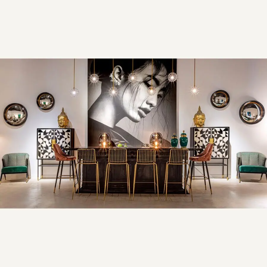 Ses pieds en métal noir et or vieilli mettent en valeur les couleurs de celui-ci.
