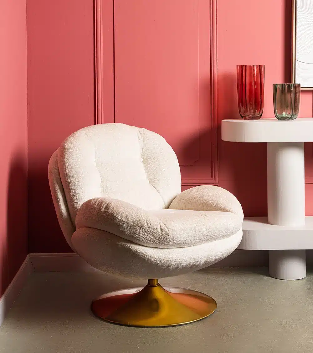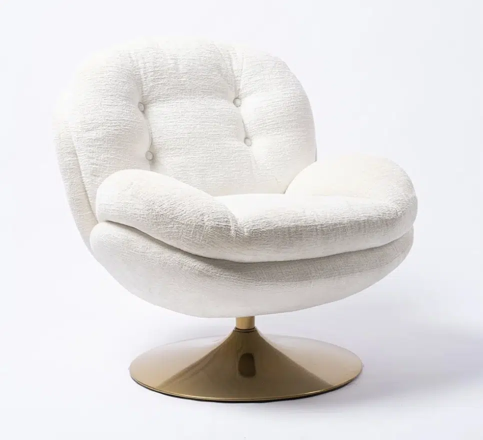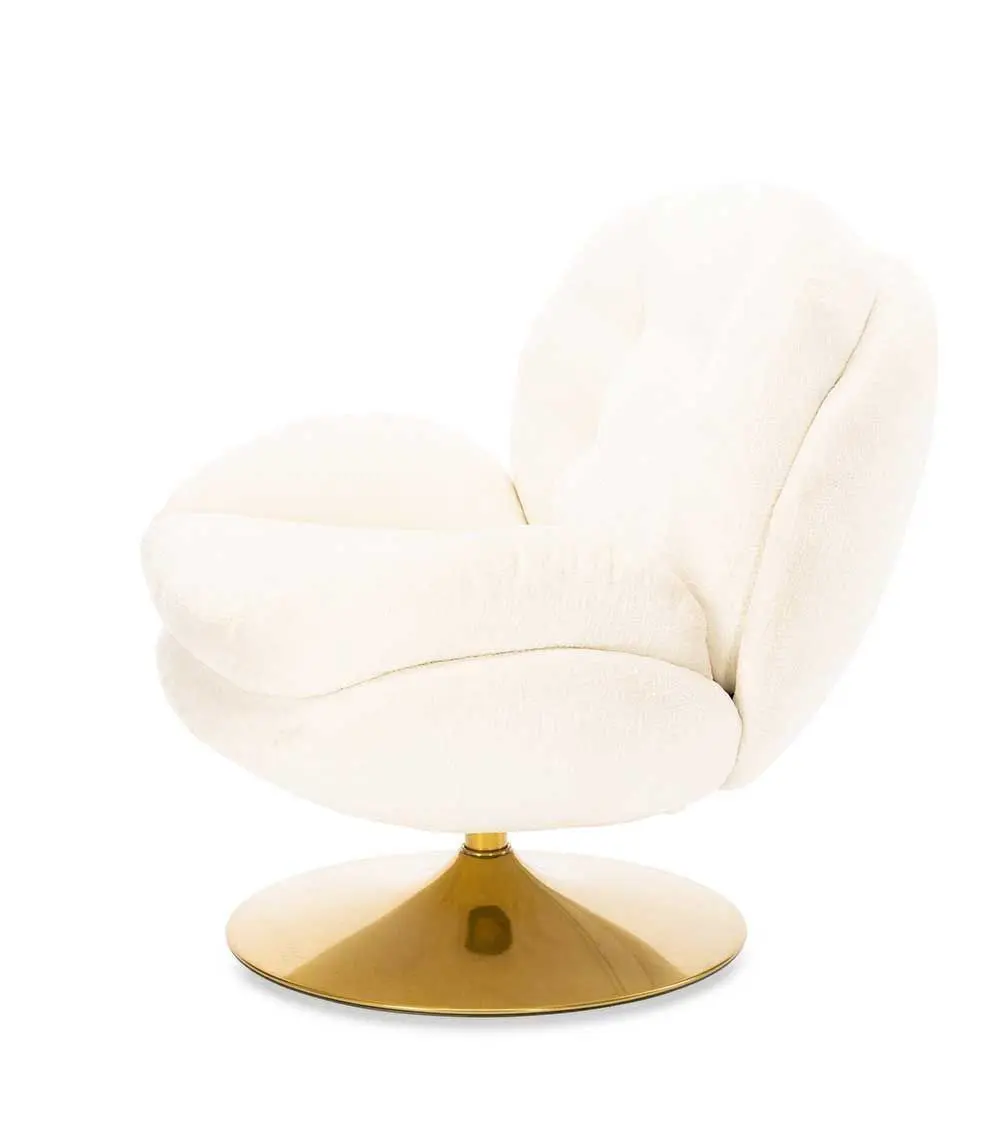 Ce fauteuil pivotant vous offre une liberté de mouvement incomparable, idéale pour votre salon, votre chambre ou votre bureau. Sa base en métal doré assure une stabilité parfaite et supporte un poids maximal de 140 kg, témoignant de sa robustesse exceptionnelle.
