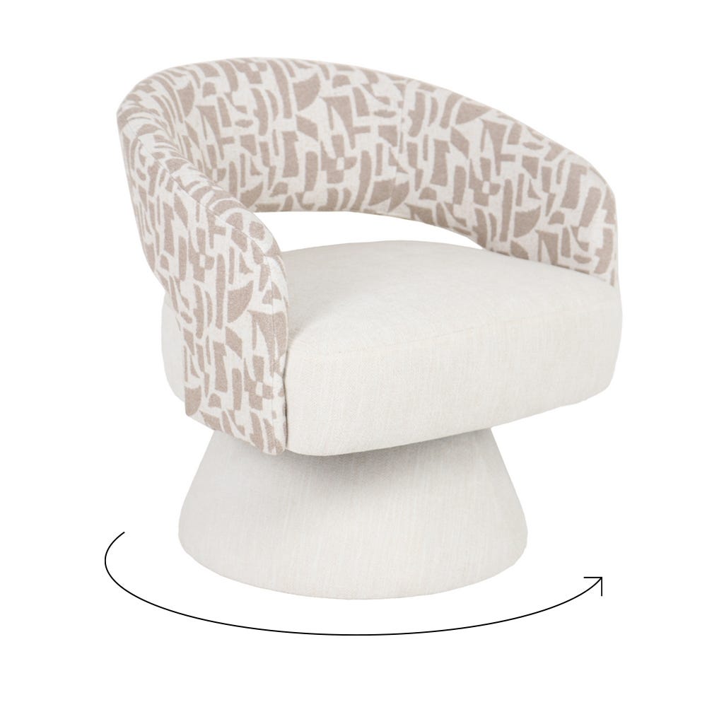 71 x 68 x 72 cm de tissu motif crème et beige sur pied rond beige uni — ce fauteuil pivotant est celui de la cohérence chromatique parfaite. Le pied rond beige uni reprend exactement la palette douce du motif du tissu, créant une harmonie de couleurs sans rupture de la base au dossier. Le motif crème-beige discret et le pied rond beige créent ensemble un siège d’une douceur visuelle et formelle incomparable.