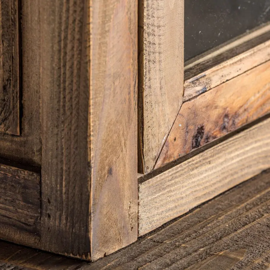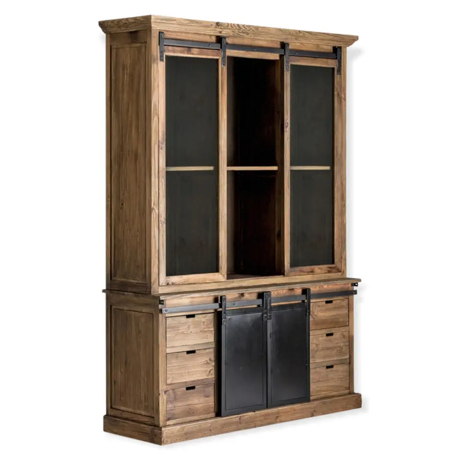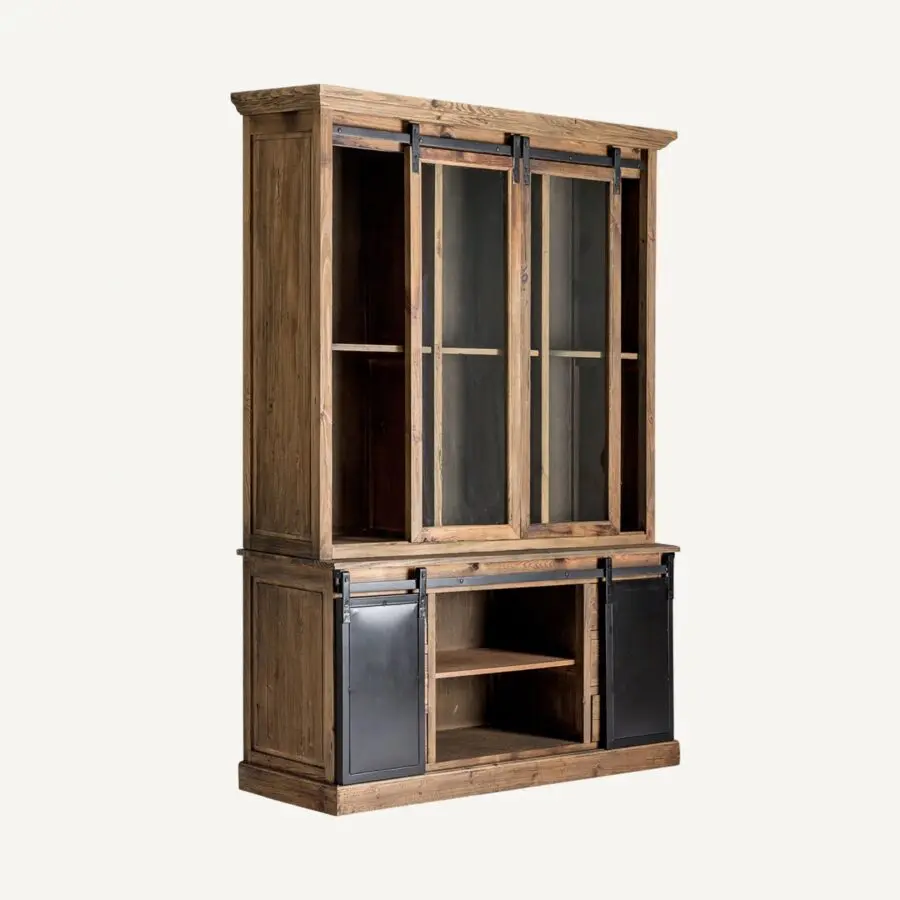La combinaison du buffet Ikast et de la vitrine Ikast forme ce magnifique vaisselier tout en bois de pin recyclé au style très industriel.