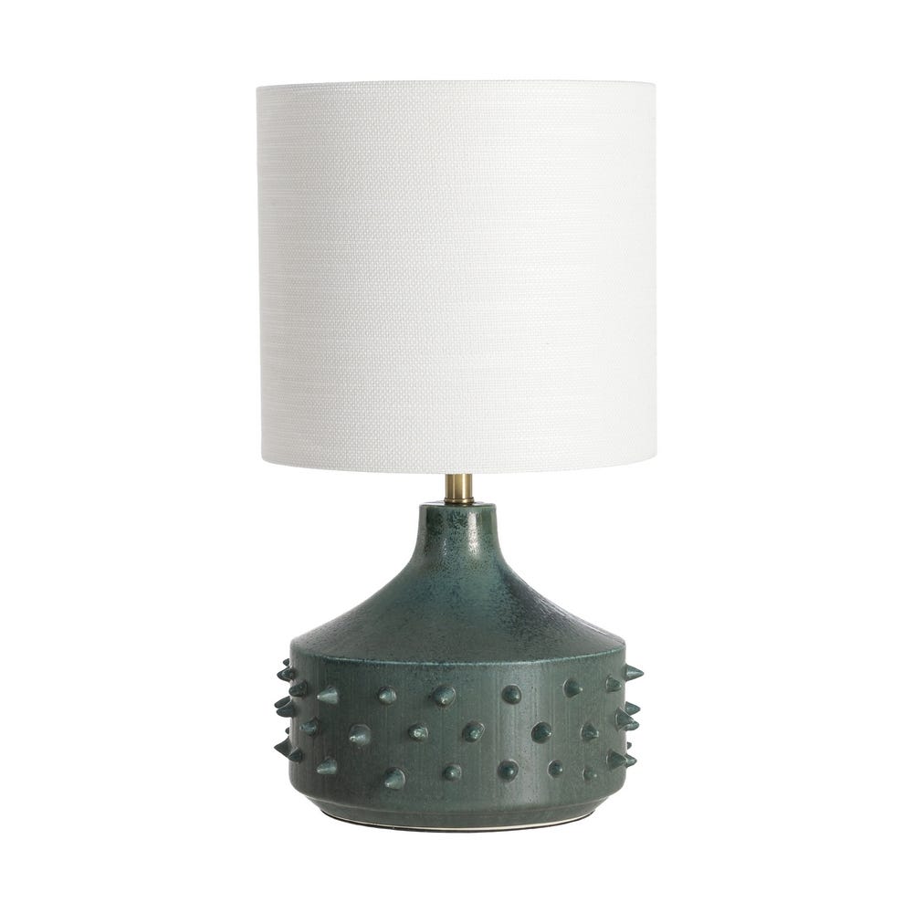 63 cm de hauteur, pied en céramique verte et abat-jour en lin blanc — cette lampe à poser apporte dans le salon ou la chambre le caractère botanique et naturel de la teinte verte dans un luminaire au caractère artisanal affirmé. La céramique verte avec ses tonalités végétales naturelles et l’abat-jour en lin blanc qui diffuse une lumière douce et neutre créent un accord de couleur frais et très contemporain.