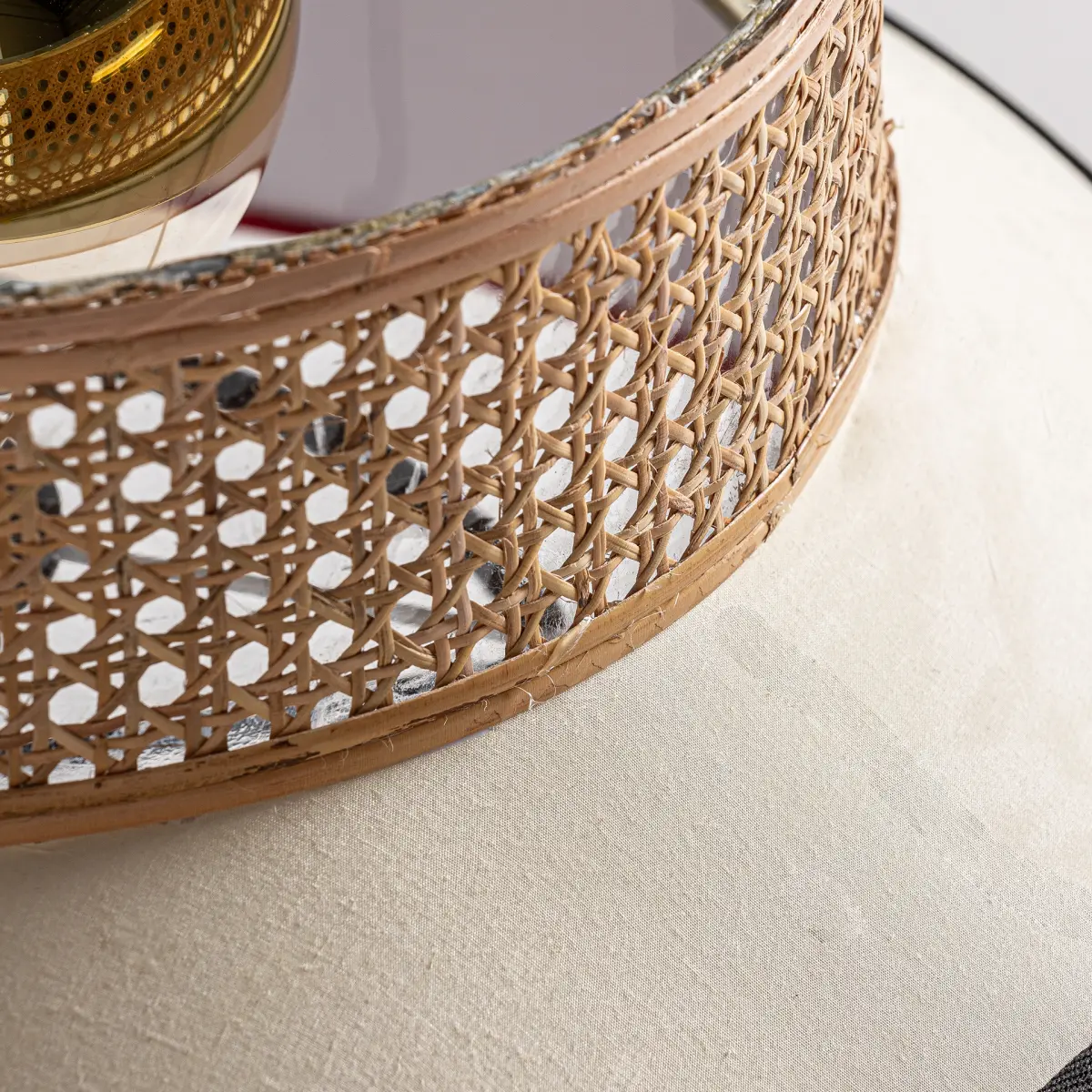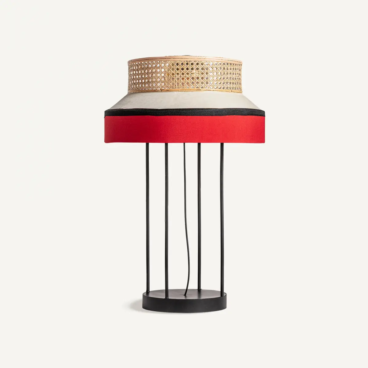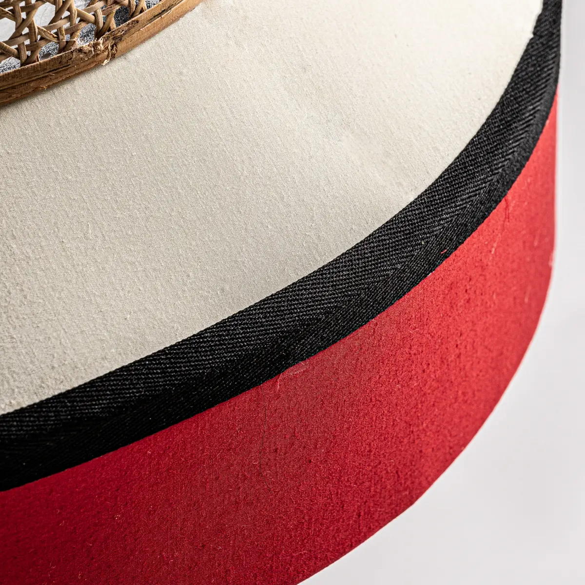 Lampe de salon, couleur blanc/rouge, style kitsh. Fabriqué en rotin, combiné avec coton et fer.