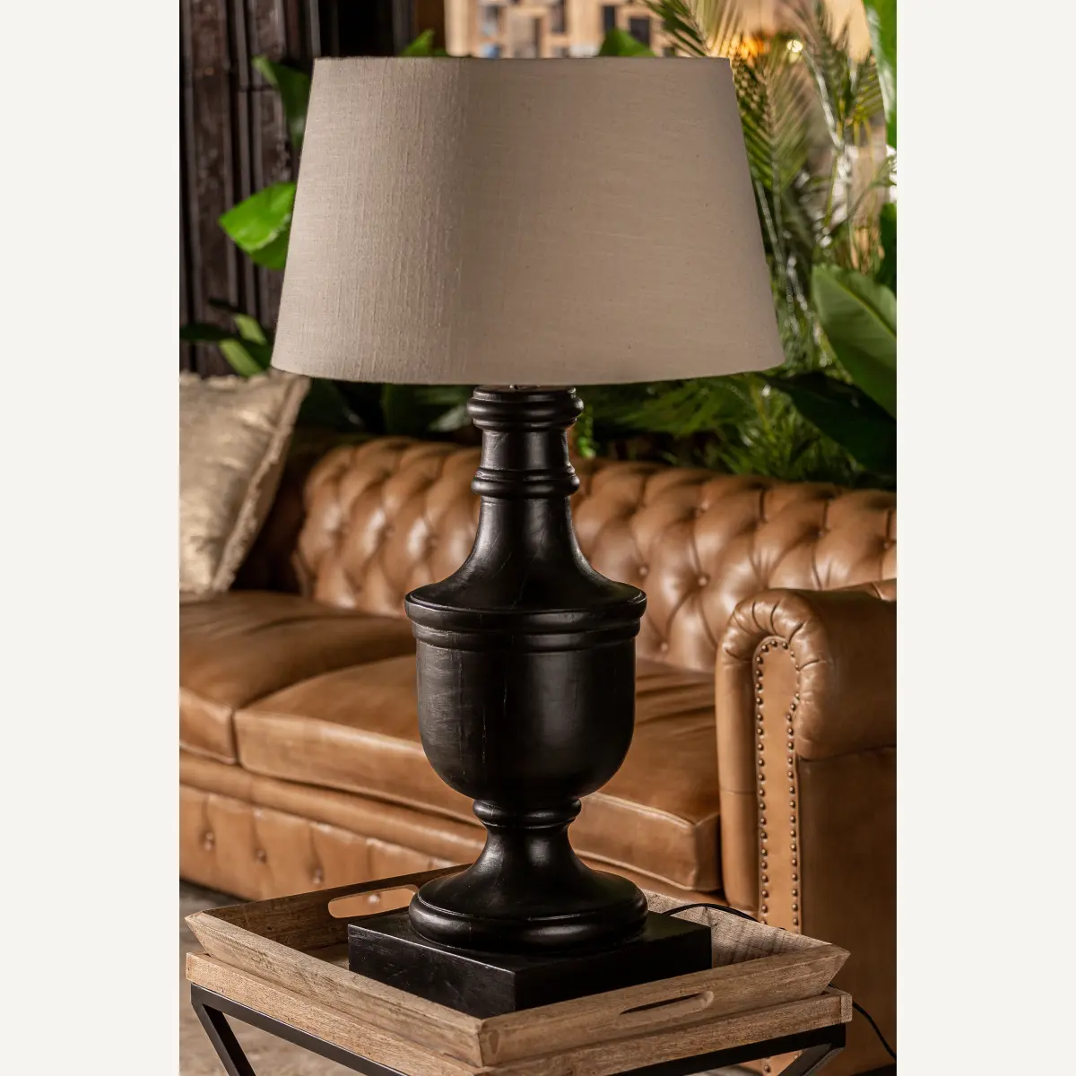 Lampe de salon, couleur noir, style provençal. Fabriqué en bois de mangue, combiné avec coton