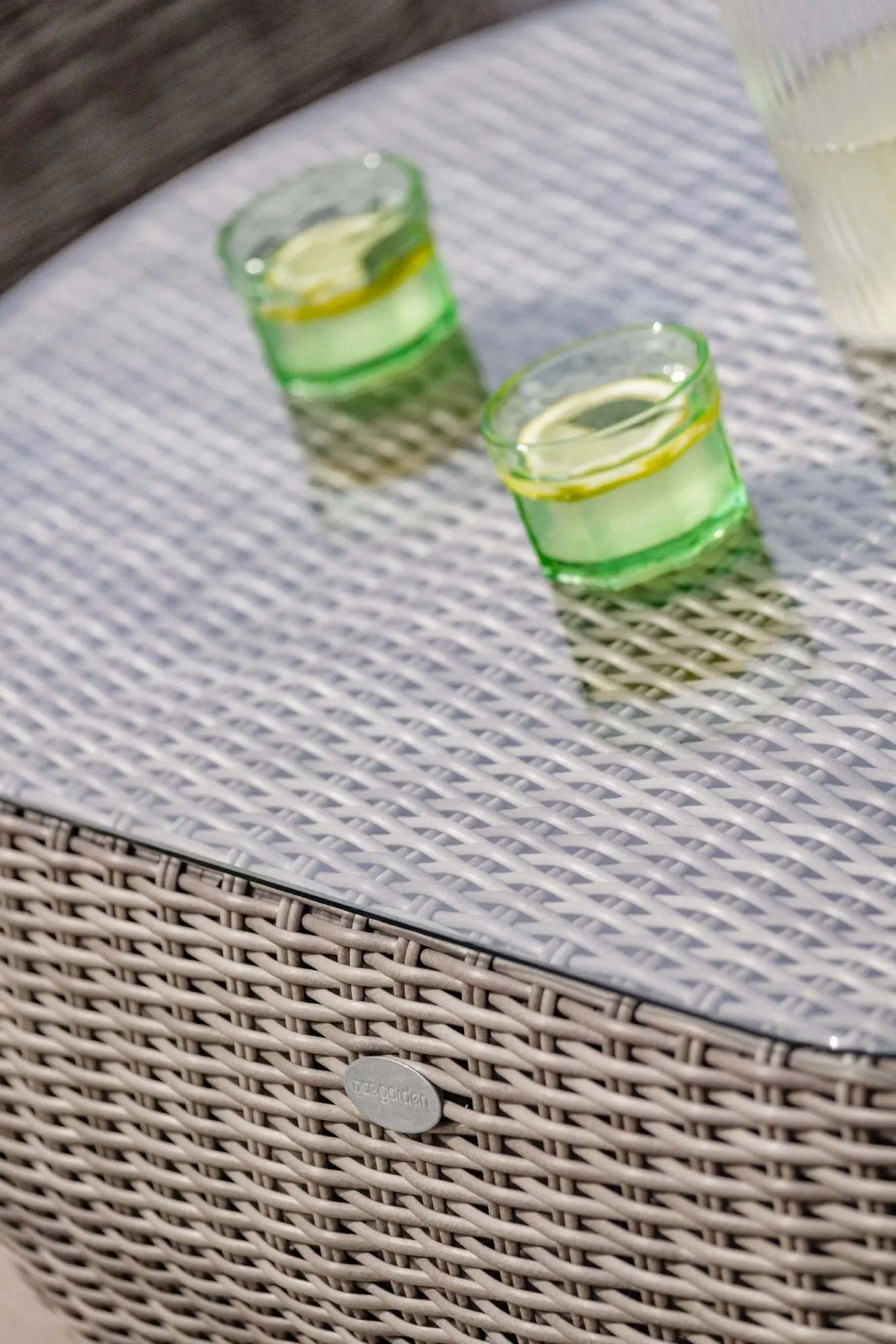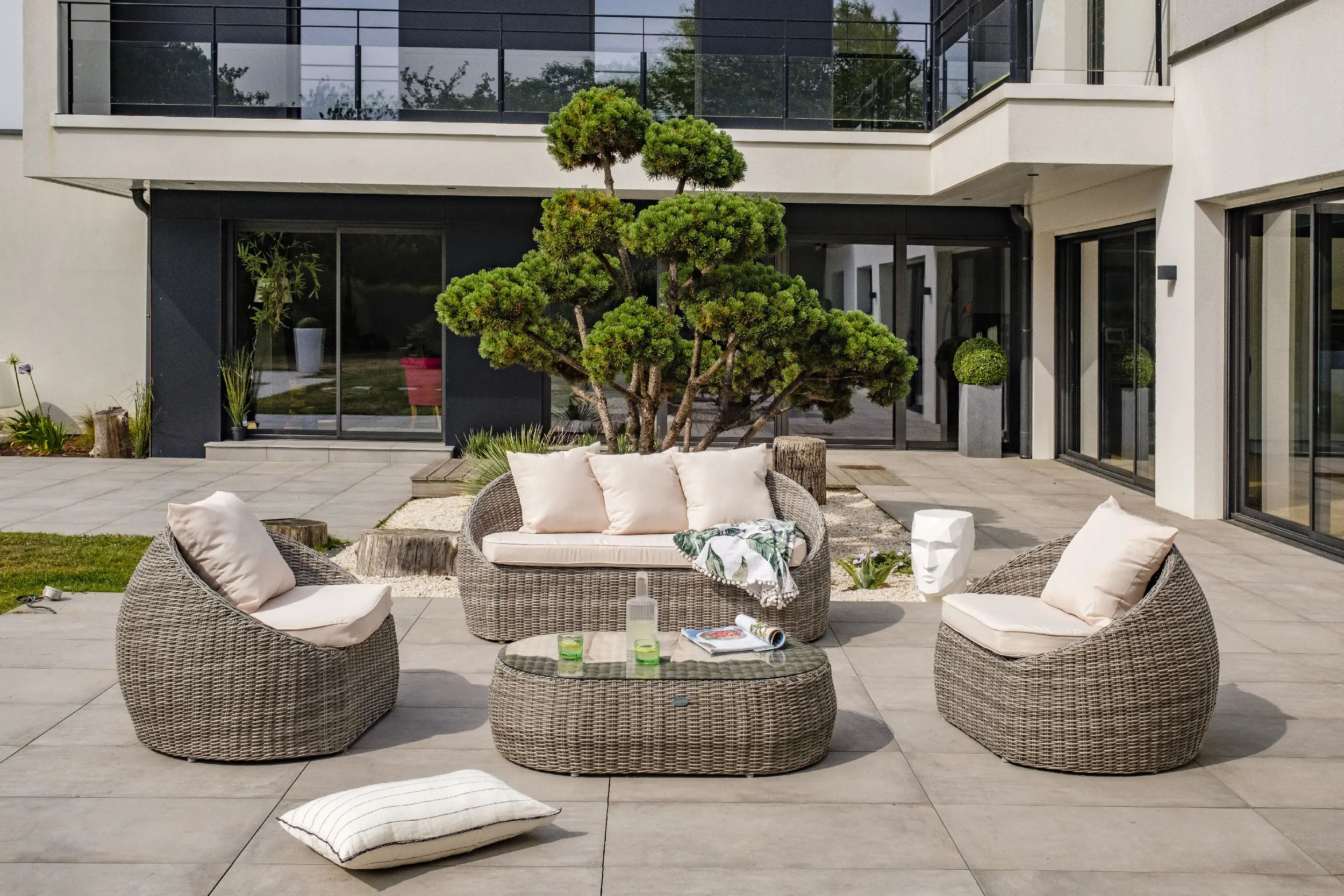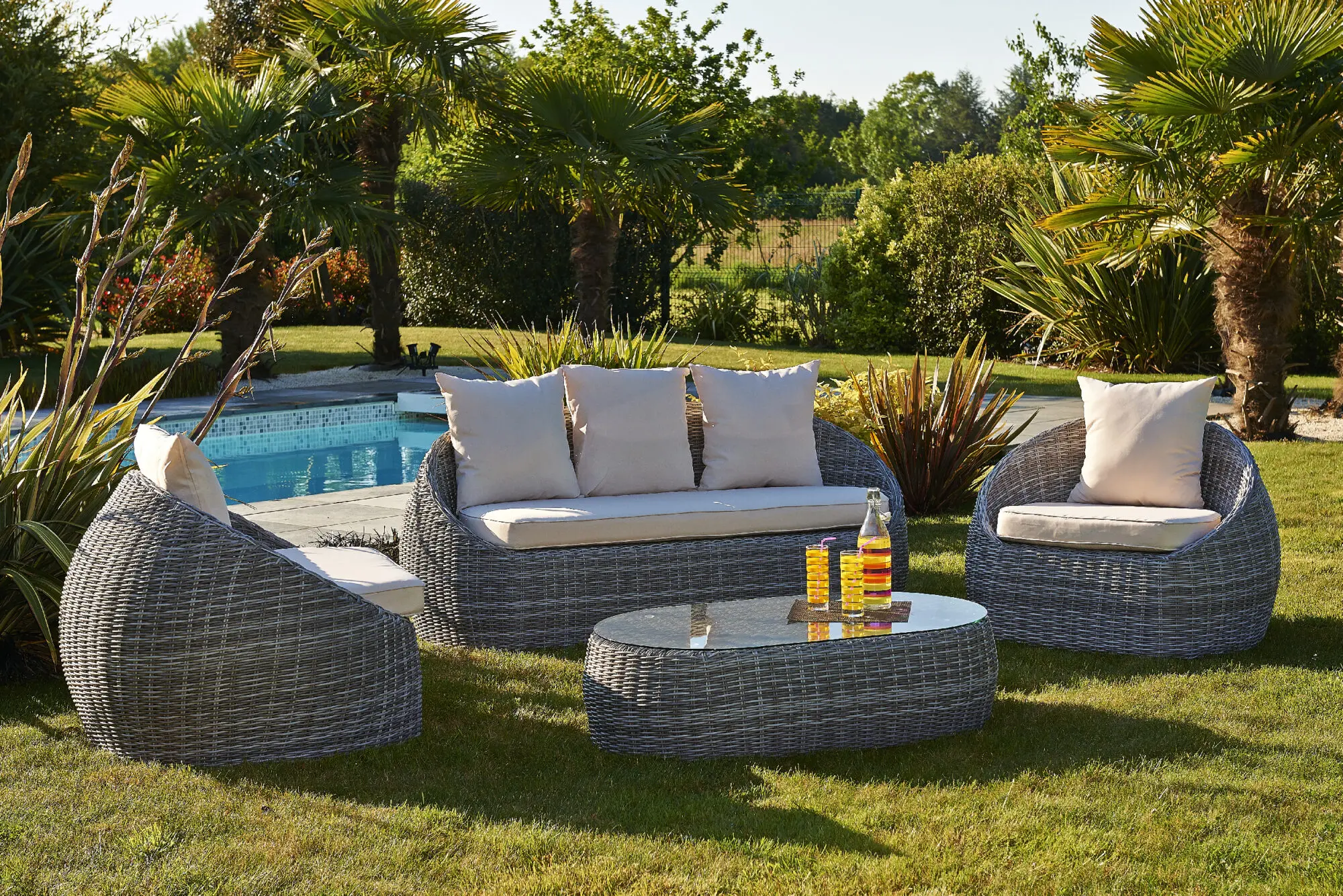 Le salon bas de jardin ISA en résine tressée demi-ronde se différencie par ses formes arrondies et ses couleurs chaleureuses.
