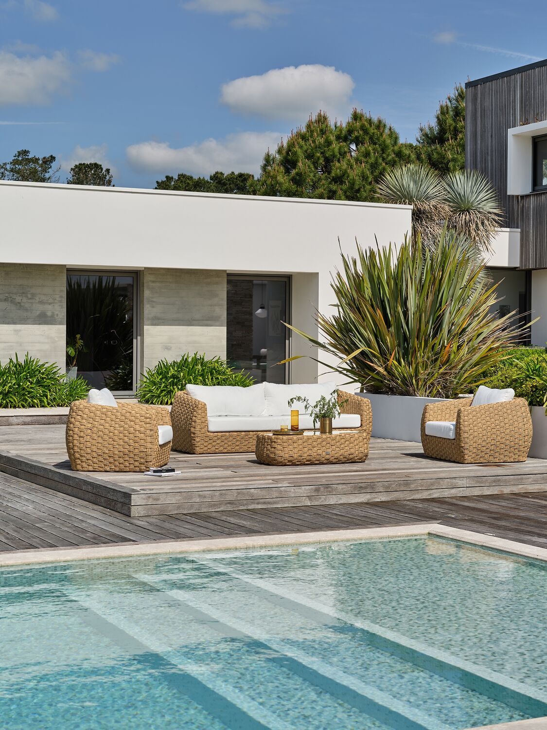 Pensé comme un véritable mobilier de salon transposé en extérieur, le Candinia donne un air particulièrement élégant aux terrasses qu’il habille avec raffinement. Le tressage main, dense et régulier, crée un jeu de matière naturel qui se marie aussi bien avec une terrasse en bois qu’avec un sol minéral autour d’une piscine.