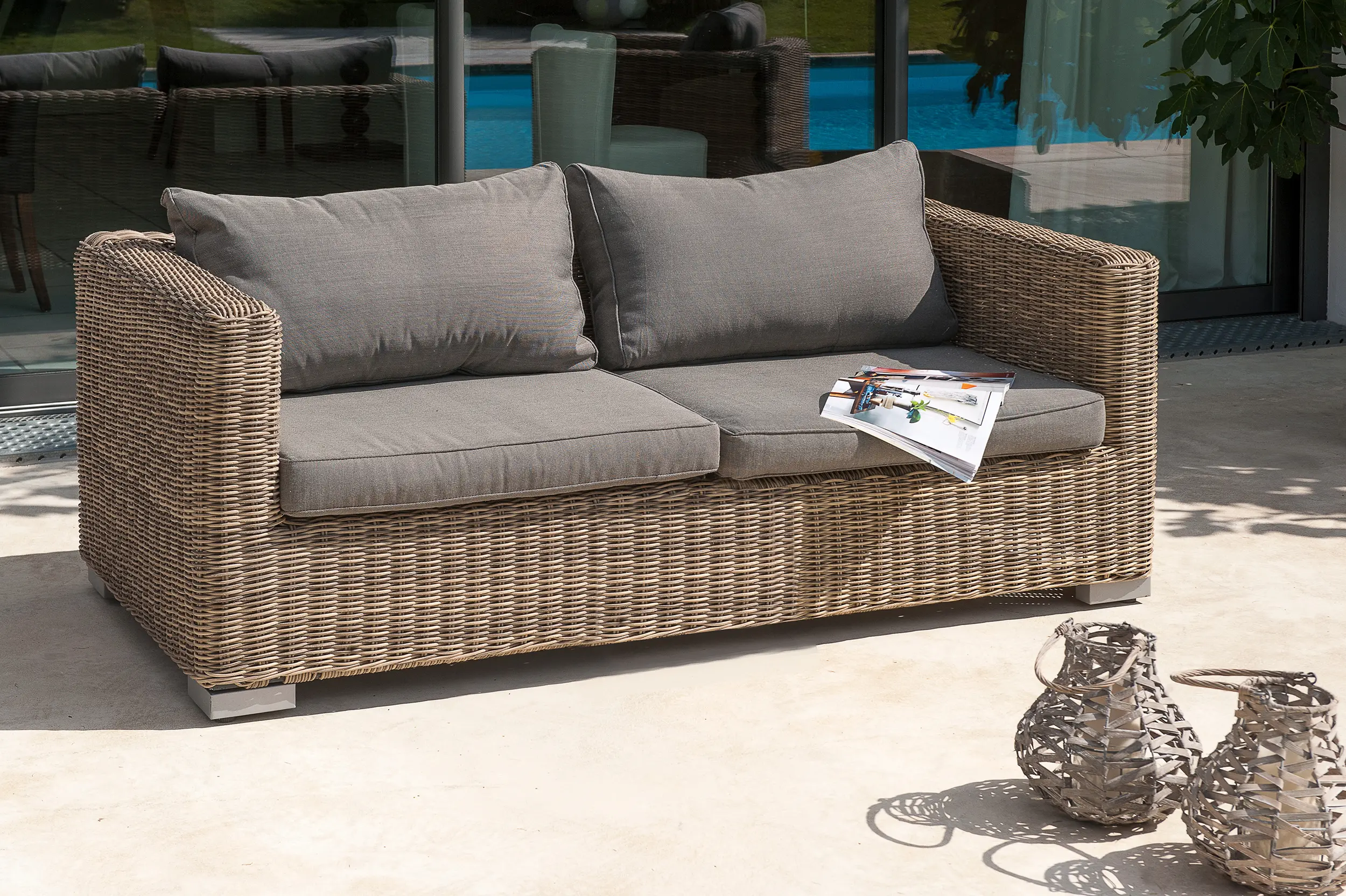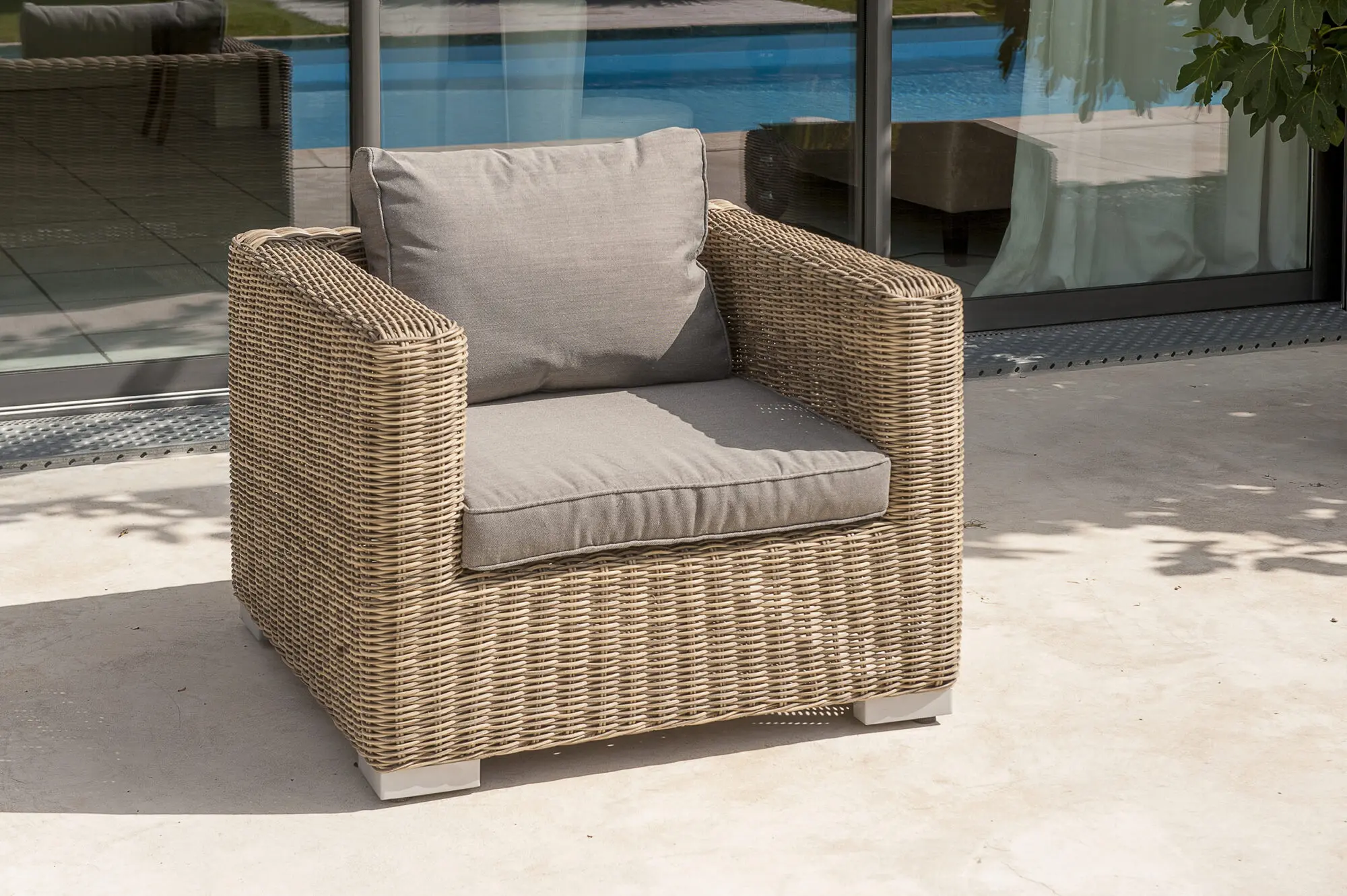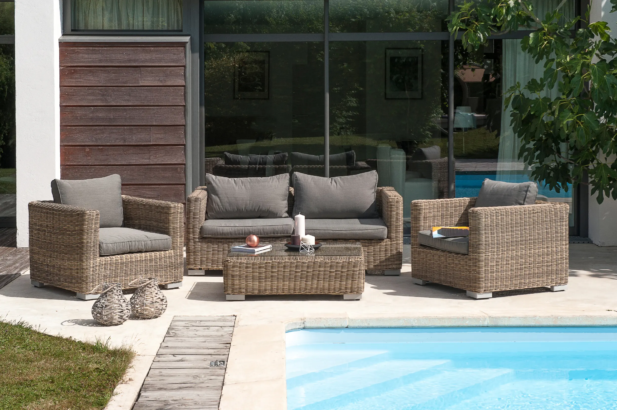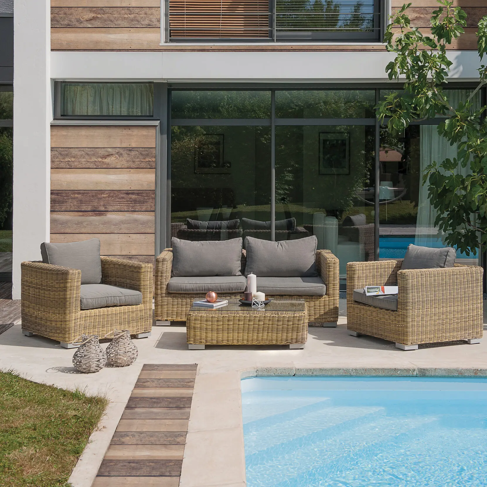 Le salon de jardin en résine tressée ronde MONTMARTRE 4 places est en résine tressée coloris miel de grande qualité.