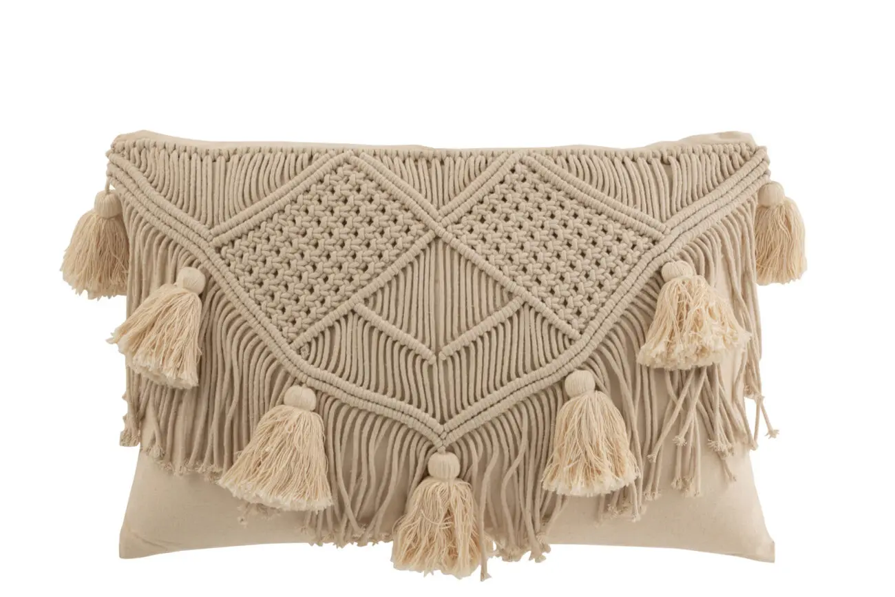 Coussin macramé en coton rectangulaire avec pompom beige SANA