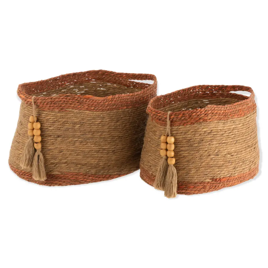 Set de 2 paniers ovales avec perles naturel et brun