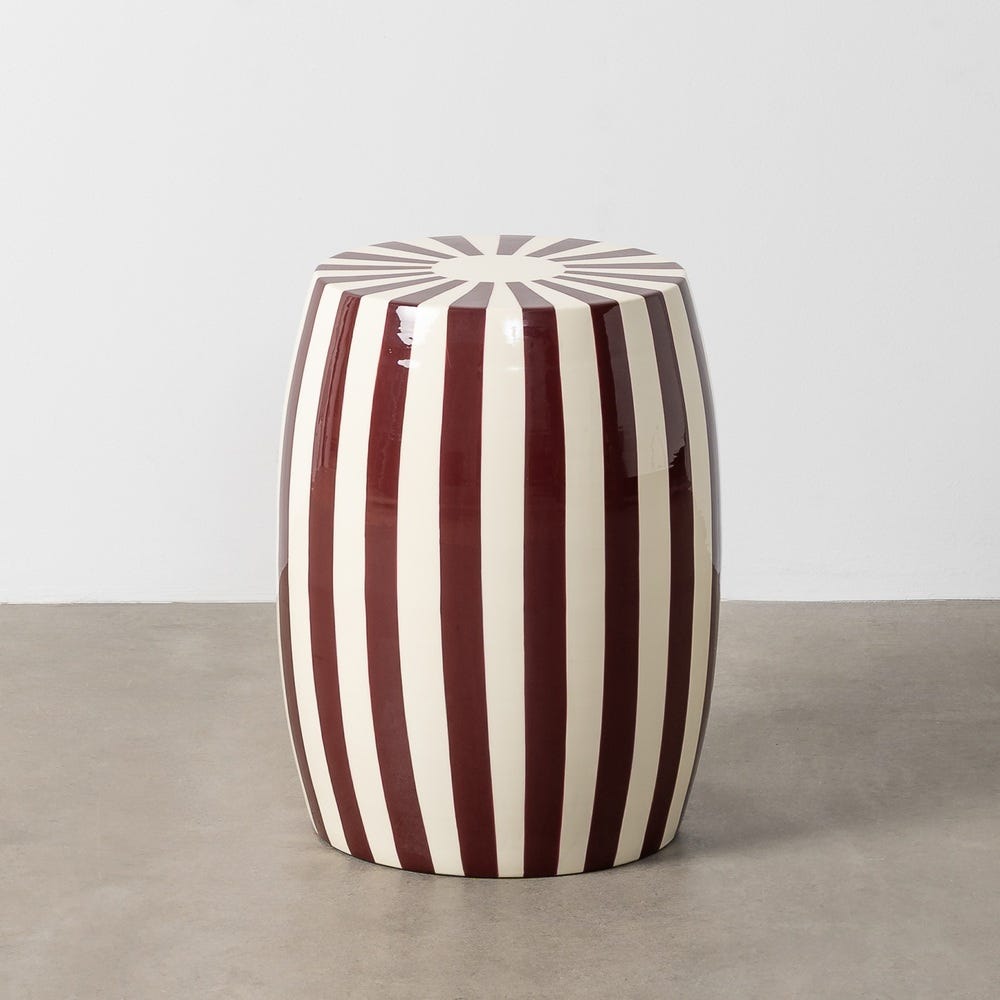 Les rayures bordeaux et blanc sur cette table d’appoint en acier créent un motif graphique élégant et sophistiqué. Son format légèrement plus compact de 35 x 35 x 46 cm en fait la table d’appoint idéale pour les petits espaces ou comme second meuble d’appoint en complément de la table bordeaux sculptural de la même gamme.