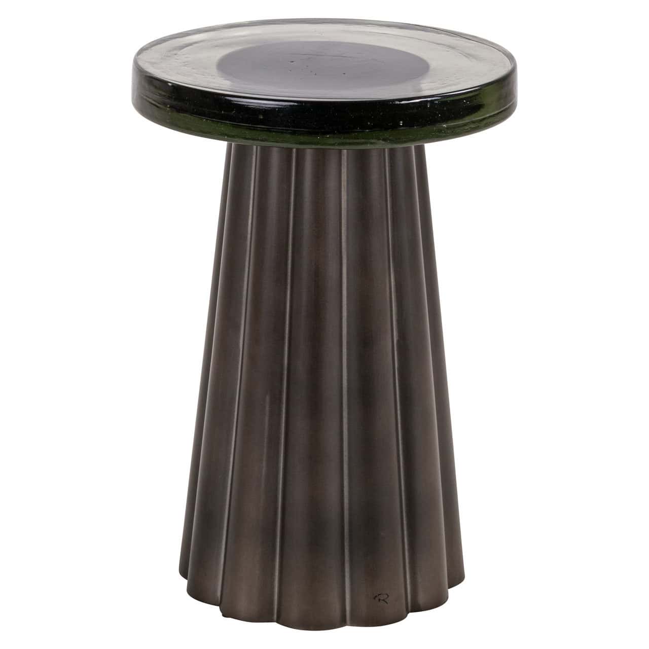 Fer, verre coulé, finition laiton antique. Table d’appoint ronde Ø35 cm en laiton antique et verre coulé. Finition chaleureuse et artisanale.