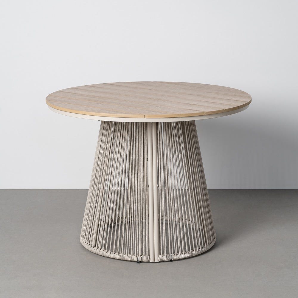Associée aux chaises jardin rotin acier de la gamme, elle compose l’ensemble repas extérieur le plus cohérent et le plus naturel. Sa forme ronde facilite la conversation autour de la table et crée une dynamique conviviale parfaite pour les repas en plein air.